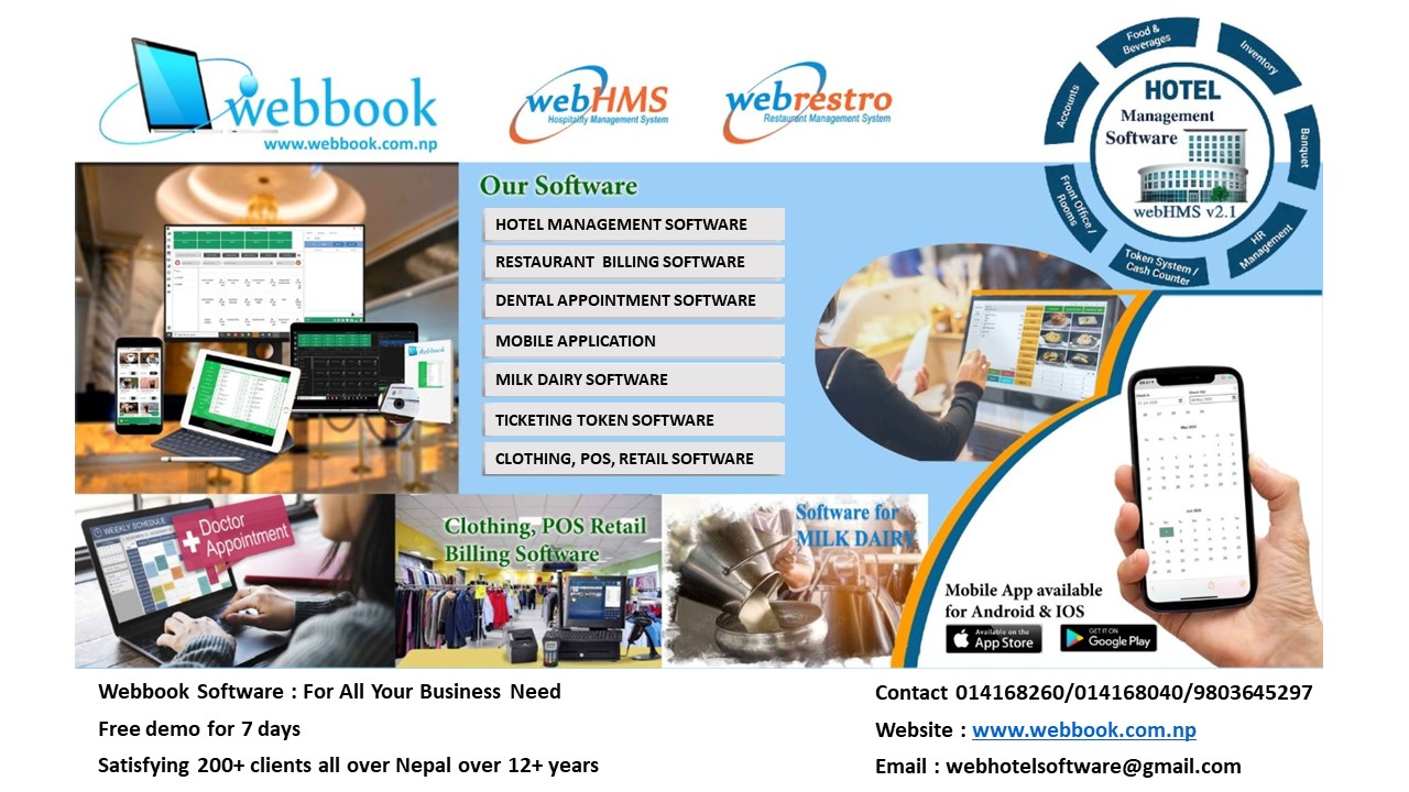 Webbook is a leading IT company in Nepal which is promoted by group of Microsoft Certified Professional Developers. Our sevices include Web Design and Development, Software Development, Mobile Application, Search Engine Optimization, Web Domain and Web Hosting, Customized Reports generation, CMS Development, IT Outsourcing Solution Nepal and Offshore Outsourcing.